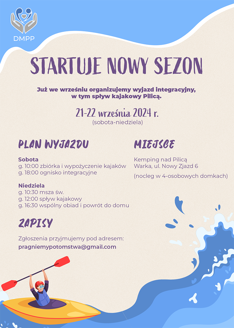 Miło nam poinformować, że w dniach 21-22 września 2024 roku organizujemy wyjazd integracyjny naszego Duszpasterstwa, w tym spływ kajakowy Pilicą, na który już teraz serdecznie zapraszamy.